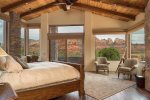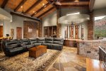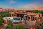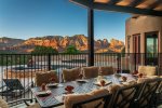 The expansive, private outdoor patio is the epitome of Sedona’s outdoor lifestyle with a true desert ambiance and sweeping views of Coffeepot Rock from every corner. An outdoor kitchen with a BBQ and seating for 10 sets the tone for long leisurely meals with a beautiful double negative edge pool perched for ultimate mountain views. As the sun sets and the hues of red and orange over the mountains turn to a galaxy of stars, your private hot tub is the ultimate spot to enjoy one of Sedona’s biggest attractions, unobstructed views of the heavens! You can also relax around the gas fire pit and relive all the adventures of the day.